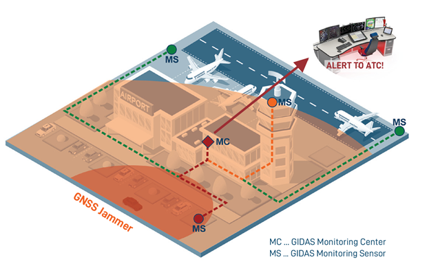 機場及其周邊空域的GNSS訊號一旦受到干擾(如圖中紅色區域所示的GNSS Jammer影響範圍),可能嚴重影響進離場航班的導航精度;透過部署如GIDAS MS(監測感應器)並連接至MC(監控中心),可即時向空管中心(ATC)發出告警,保障飛行安全。