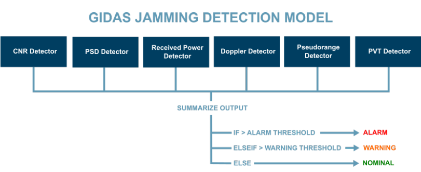 GIDAS 干擾偵測模型整合了CNR、PSD、接收功率、都卜勒、偽距及PVT等多種偵測器的輸出,進行加權評估並根據預設閾值產生告警(ALARM)、警告(WARNING)或標示正常(NOMINAL)的決策 。