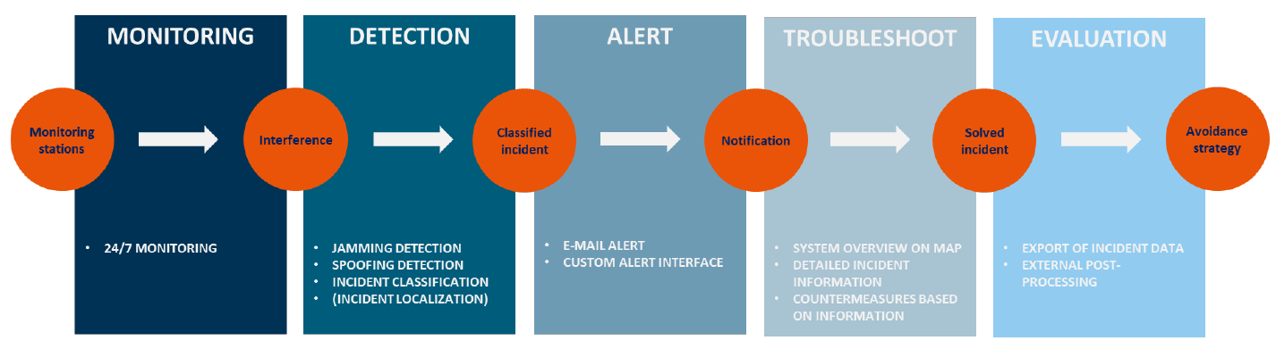 GNSS干擾對依賴PBN的現代航空服務構成了真實且日益嚴峻的威脅 。永久性安裝的GNSS品質保證系統,如OHB GIDAS Stationary,透過24/7全天候監測GNSS訊號與服務,能在干擾對飛行安全構成實際風險前,向營運商和高層系統發出告警;OHB的監測系統證實,即使遠離軍事衝突區域,干擾也是一種日常可觀測到的現象 。