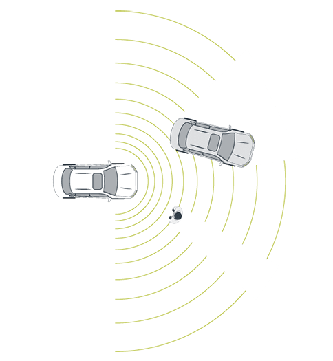 汽車雷達系統運作示意圖,展示了雷達波束的偵測範圍,例如:用於盲點警示 (BSW) 等ADAS功能;這類高頻RF系統是構成車輛複雜電磁環境的因素之一。