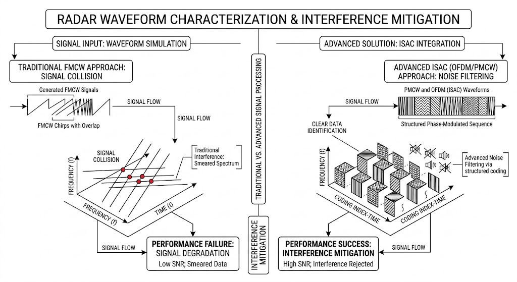 與此同時,隨著 6G 通訊技術的發展,「整合感測與通訊(ISAC, Integrated Sensing and Communications)」正成為車用電子的下一個顯學。ISAC 系統企圖在同一個硬體前端與同一個頻段內,利用正交分頻多工(OFDM)等複雜波形,同時完成環境的雷達探測與車對車(V2V)的高速資料傳輸。