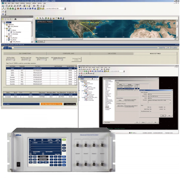 為更精確模擬GNSS訊號在複雜環境(如都市峽谷、室內)中的傳播特性(多路徑、衰減、相位變化等),可採用如DBM ACE9600 先進通道模擬器(硬體如圖下方所示,軟體介面如圖上方所示)等專業設備,對GNSS模擬器輸出的RF訊號進行處理後再送入待測系統。