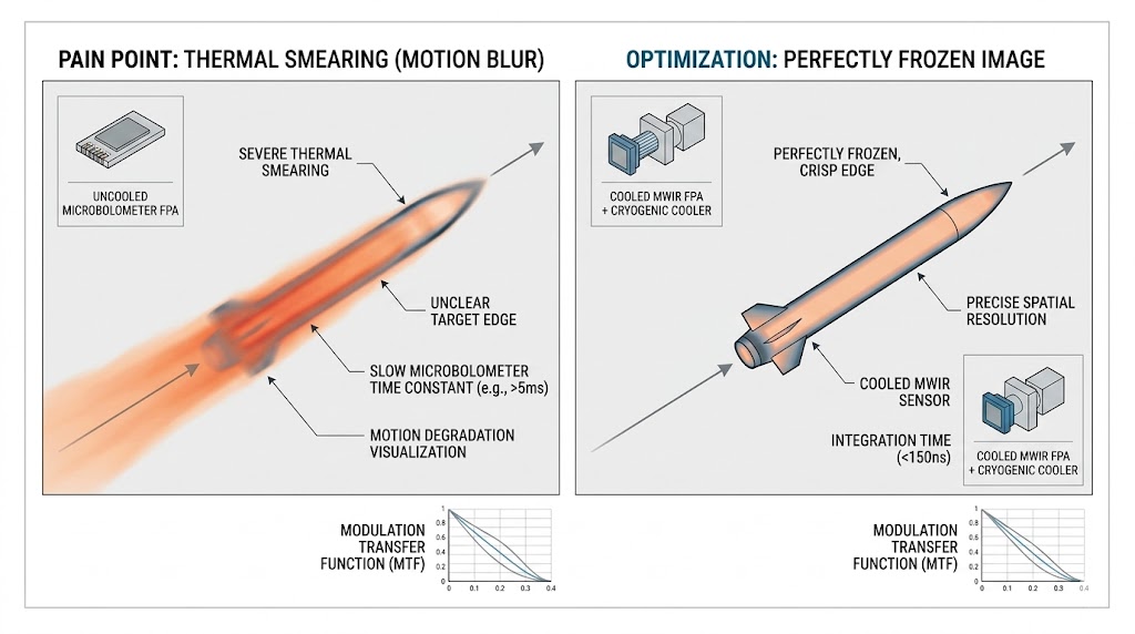 示意圖中比較非冷卻微輻射計(左)與冷卻式中波紅外感測器(右)捕獲高速目標,非冷卻式慢時間常數致熱拖影(左),極短積分時間(<150ns)凍結影像並維持精確空間解析度(右),MTF也優化。