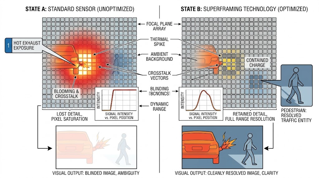 示意圖中對比熱成像感測器效能:左側標準感測器因高溫廢氣導致畫素飽和、光暈與串擾,造成視覺喪失與細節遺失;右側「超幀」(SuperFraming)技術能精確解析峰值高溫點,完整保留完整細節並清晰呈現行人細節。