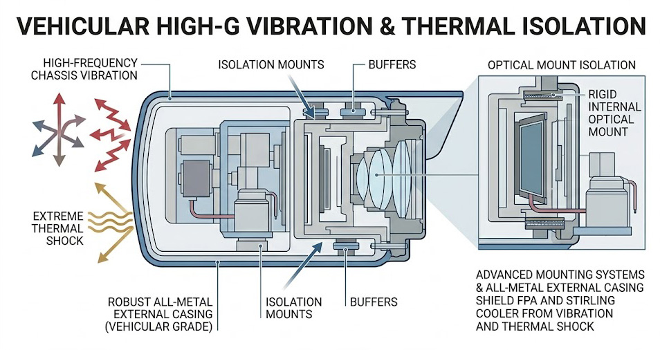在實際路測或車輛底盤整合中,設備必須承受來自路面的連續高頻微震動以及引擎室的劇烈溫差變化,若將一般實驗室等級的開放式熱像儀直接部署於測試車輛上,其光學鏡頭與焦平面陣列 (FPA) 的對位極易因熱脹冷縮與震動產生次像素級的偏移,這不僅會劣化調變轉換函數 (MTF) 導致影像模糊,環境溫度的劇烈波動更會引發感測器嚴重的基線熱漂移,使得內建的非均勻性校正 (NUC) 失效,直接汙染演算法訓練所需的原始數據。