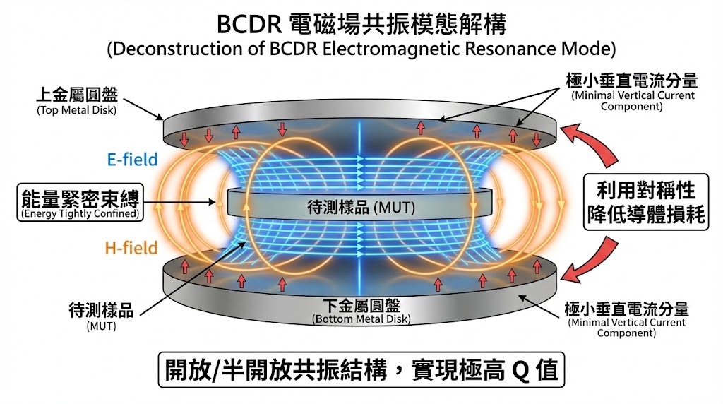 與傳統封閉式腔體不同,BCDR 的結構設計允許電磁場在特定的共振模態下,將能量緊密地束縛在兩個圓盤與樣品之間,形成一種開放或半開放的共振結構,這種設計巧妙地利用了電磁場的對稱性,使得垂直於圓盤表面的電流分量極小化,從而大幅降低了金屬導體的損耗,確保系統擁有極高的品質因子(Q 值),這對於量測低損耗材料(Low Loss Material)至關重要,因為只有系統本身的損耗夠低,才能靈敏地偵測出材料所造成的微小能量衰減。