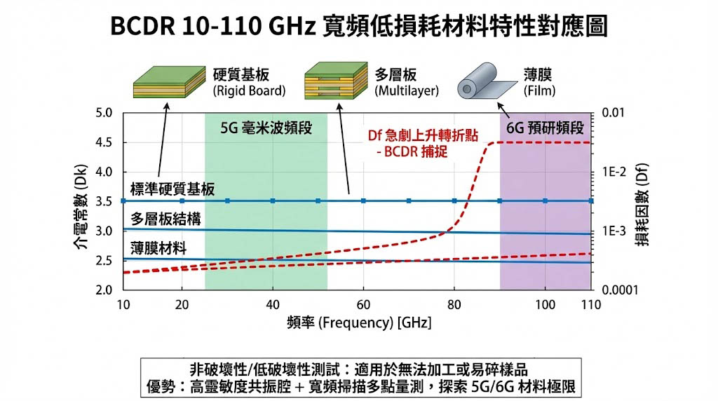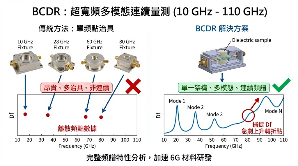 新一代的 BCDR 解決方案可以支援 10 GHz 至 110 GHz 的超寬頻率範圍,工程師不需要為每一個頻點購買一顆昂貴的治具,在同一個 BCDR 架構下,透過激發不同的高階共振模態(Modes),可以在極寬的頻譜上取得多個頻率點的連續量測數據;這種「多頻連續量測(Multi-frequency continuous measurement)」能力,對於 6G 材料研發具有極高的價值,例如某些高分子材料在 20 GHz 時表現穩定,但在 80 GHz 時 Df 值可能會因為分子極化機制的改變而急劇上升,BCDR 能夠在單次架設中捕捉到這些關鍵的轉折點,提供工程師完整的頻譜特性分析。