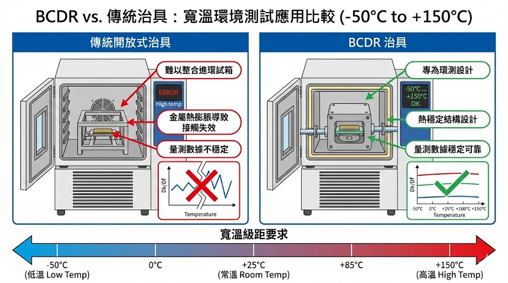 BCDR 治具在設計之初便考量了環境測試的需求,它支援從 -50°C 低溫至 +150°C 高溫 的循環測試,這讓研發工程師能夠繪製出材料的 Dk/Df 溫度係數(Tcc)曲線,確保所選用的基板或薄膜在極地寒冬或引擎室高溫下,仍能維持穩定的電氣特性。
