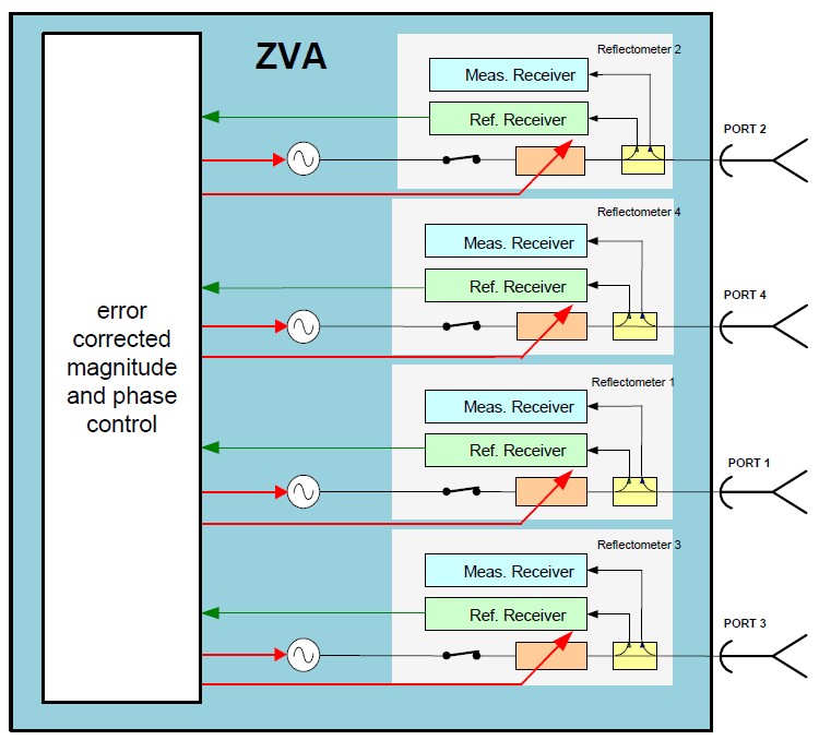 - ZVA1 根據其 Port 1 耦合器測得的參考訊號,調整其訊號源的振幅與相位;