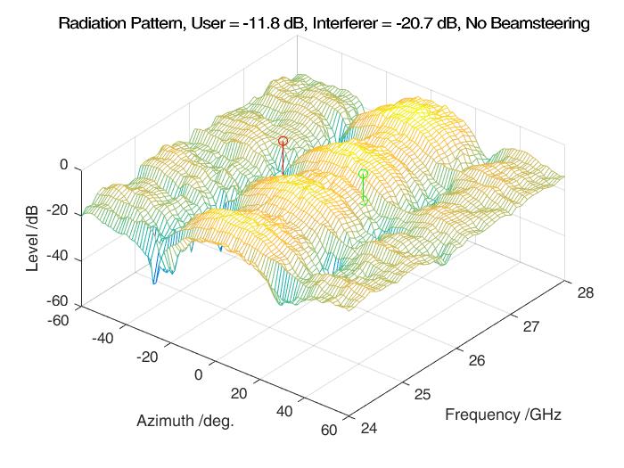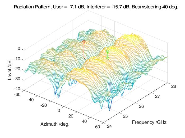 點擊「Find min. Interf.」(尋找最小干擾) 會開啟一個新視窗,顯示在上述設定下被發現能提供最佳結果(即最大抑制)的測試案例,圖 5-2 顯示了一個範例,頻率為 26.4 GHz,使用者角度為 20°,干擾者角度為 -6 度。