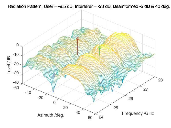 在這種情況下,干擾抑制度提升至 13.5 dB,雖然整體天線輸出功率略有降低,但訊號品質與方向性分辨能力(discrimination capability)明顯改善。