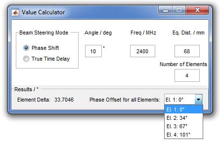 開啟如圖 5-3 所示的對話框,此視圖有助於計算不同天線架構的相移 (phase shift) 或時間延遲 (time delay) 值,在此範例中,一個具有等距元件(間距 68 mm)的天線陣列,其主波束 (main beam) 應被操控 (steered) 至 10° 的角度,因此,所有元件必須設定約 34° 的相位偏移 (phase offset)。