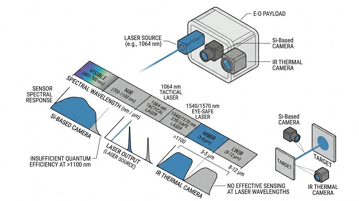 進行雷射與成像系統的對位時,首先面臨的是感測波長的不相容性,戰術雷射通常採用一零六四奈米的近紅外波段,或是改用一五四零、一五七零奈米的人眼安全波段,傳統的可見光矽基感測器對超過一千一百奈米的光子缺乏足夠的量子效率;而標準的中長波紅外線熱像儀也無法有效感測這些波段。
