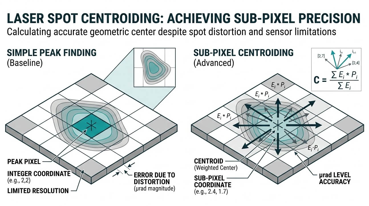 取得雷射光斑的影像後,系統必須計算該光斑的精確幾何中心,真實的雷射光束受限於發射器的模態與光學鏡片的像差,其能量分佈往往不是完美的對稱圓形,如果僅依賴尋找「最亮像素」來定義光斑中心,其解析度將受限於相機的單一像素實體尺寸,為了達到微拉弧度(µrad)等級的量測精度,系統必須導入「質心定位(Centroiding)」演算法,此演算法透過計算光斑範圍內所有像素的能量權重,得出一個位於像素網格之間的次像素(Sub-pixel)座標。
