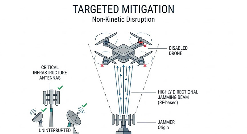 當威脅被確認後,防禦系統必須執行反制,在機場或能源設施周邊,使用實體火砲等「動力(Kinetic)」反制手段會引發嚴重的附帶損害(Collateral Damage),然而若採用傳統的寬頻干擾(Barrage Jamming),極可能癱瘓機場的塔台通訊或設施內的合法物聯網(IoT)運作,造成「電磁互擾(Electromagnetic Fratricide)」;技術團隊面臨的挑戰是,如何在融合主被動感測器的指管(C2)平台上,實現「精準打擊(Targeted Mitigation)」——亦即僅針對該威脅無人機的特定跳頻頻段或 GNSS 導航訊號進行阻斷,而不影響基礎設施的正常營運。