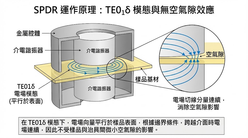 SPDR 的結構由兩個上下對稱的介電諧振器(通常由高品質因數的陶瓷製成)組成,並安裝在金屬腔體內,測試時將已移除銅箔的基材樣品插入上下諧振器之間的縫隙中,其運作原理基於 TE01δ 共振模態,在這個特定的電磁場模態下,電場向量呈現圓環狀分佈,且完全平行於樣品表面 (In-Plane);這是一個極為關鍵的物理特性,因為根據電磁場邊界條件,電場的切線分量在跨越介面時是連續的;用白話文來說,這意味著電場可以順暢地穿過空氣與樣品的交界處,而不會在「樣品與治具之間的微小空氣隙 (Air Gap)」處產生不連續或電位降。