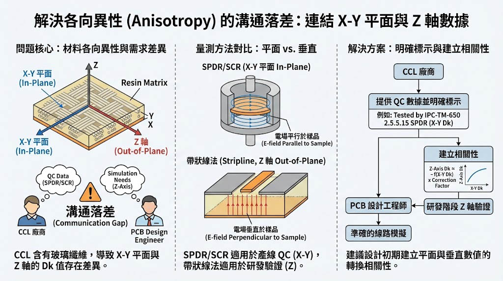 值得注意的是無論是 SPDR 還是 SCR,其量測的都是材料 X-Y 平面 (In-Plane) 的特性,然而 PCB 設計工程師在進行線路模擬時,往往需要的是 Z 軸 (Out-of-Plane) 的數據(因為訊號與電場主要垂直於板材),對於含有玻璃纖維的 CCL 材料,X-Y 平面與 Z 軸的 Dk 值通常存在差異(各向異性),因此 CCL 廠商在提供 QC 數據時,應明確標示測試方法(如 "Tested by IPC-TM-650 2.5.5.15 SPDR"),並建議客戶在設計初期建立平面與垂直數值的轉換相關性,或搭配 帶狀線法 (IPC-TM-650 2.5.5.5) 進行研發階段的 Z 軸驗證。