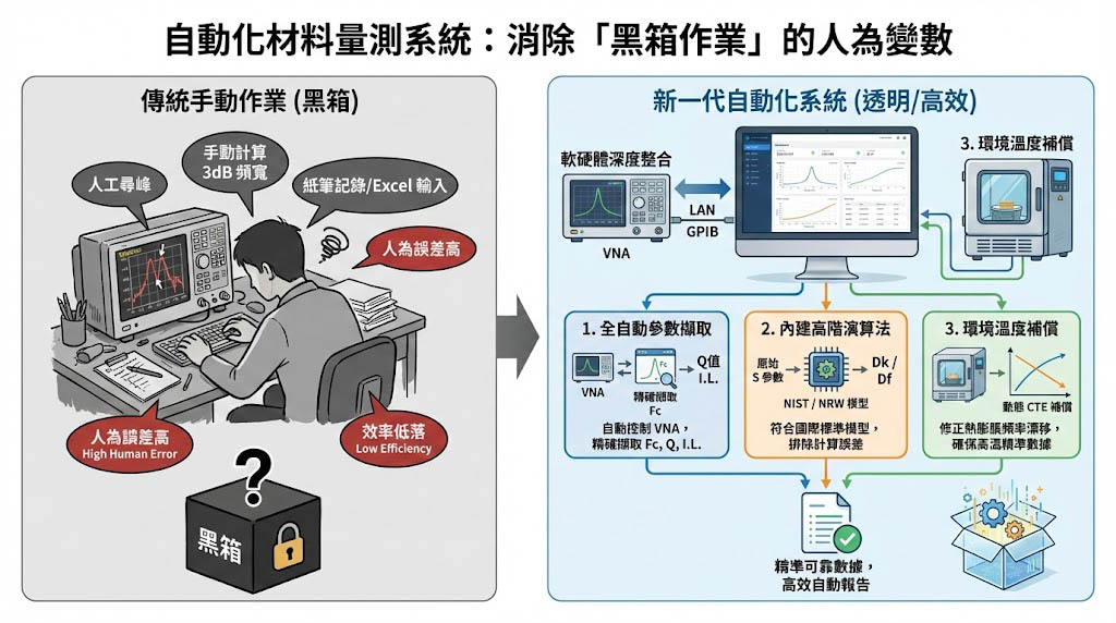 即使擁有精密的治具與昂貴的向量網路分析儀 (VNA),若缺乏自動化軟體的輔助,測試過程仍充滿變數,人工手動尋找共振峰 (Peak Search)、計算 3dB 頻寬、讀取數據並輸入 Excel 的過程,不僅效率低落,更容易發生讀數錯誤或計算公式誤用。