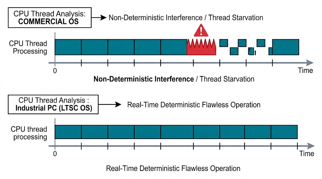 在許多研發實驗室與早期的原型機中,工程師習慣使用搭載標準商用版 Windows 作業系統的高階個人電腦來運行控制軟體與軌跡演算法,然而這在軍事部署或長時間衛星通訊追蹤中,是一場潛在的災難;標準的商用作業系統充滿了不受控制的背景服務、索引程式、以及強制性的安全性與功能更新(Feature Updates),在執行高頻寬的運動控制時,作業系統的中央處理器(CPU)資源必須保證隨時可用。如果系統在追蹤過程中突然啟動了一個背景更新程式,會導致控制執行緒產生數十毫秒(Milliseconds)的「資源飢餓(Thread Starvation)」。