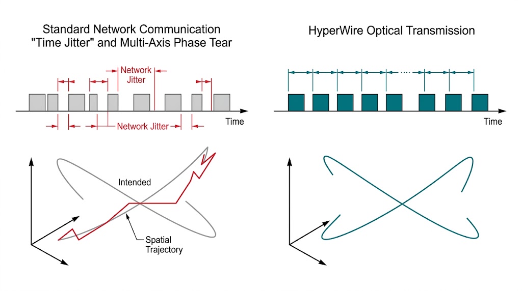 此圖對比標準網路(左,抖動造成相位撕裂,軌跡偏離)與 HyperWire 光學傳輸(右,超低抖動,軌跡貼合),展示高精度運動控制優勢