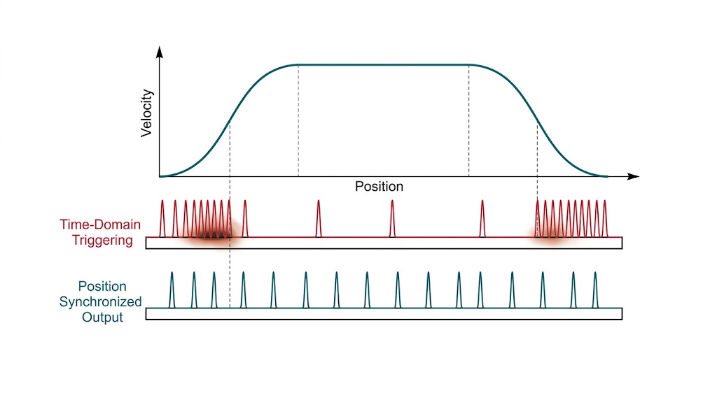 在 ISAC 或雷射武器系統中,雷射的擊發必須極度精準,傳統的控制架構通常採用「時域觸發(Time-Domain Triggering)」,亦即依賴軟體計時器,每隔一段固定的時間(例如每 10 微秒)命令雷射發射一個脈衝;這在物理上隱藏著一個巨大的幾何破綻:雲台在追蹤目標時,其角速度絕對不可能是恆定的,它必須經歷頻繁的加速、減速與微調,如果雷射以恆定「時間」頻率擊發,當雲台減速時,雷射脈衝在空間中的物理距離就會擠在一起,導致該區域能量過度集中(造成感測器過曝或材料異常熔毀);當雲台加速時,脈衝之間的空間距離就會拉開,導致通訊封包遺失或破壞力不足。