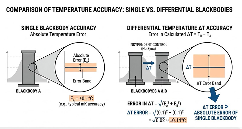 當使用兩台具有獨立控制器的黑體時,兩者之間不存在硬體層級的通訊與同步反饋,從統計學與誤差傳遞的客觀邏輯來看,兩個獨立變數的總誤差,等於兩者個別誤差平方和的平方根,如果黑體 A 與黑體 B 各自的絕對溫度準確度為千分之十度,當系統計算兩者的差動溫度(ΔT)時,其溫差誤差將大於單一黑體的絕對誤差;此外,兩台控制器的數位類比轉換器(DAC)取樣頻率與 PID 演算法的響應時間若存在微小差異,將導致兩者的溫度微幅震盪(Jitter)在時間軸上產生相位差,使感測器捕捉到的瞬時溫差出現隨機漂移。