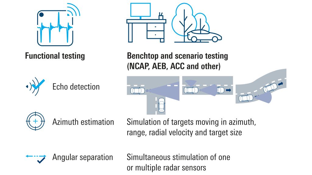 從簡單的測試場景開始,例如:單個雷達感測器的組件測試,為了測試雷達感測器是否正確偵測到回波,需要區分給定距離或給定角度的兩個目標,以及雷達感測器的角度解析度;次要測試場警包括:多車交通場景、緊急煞車系統或自適應巡航控制,目標是模擬移動目標的方位角、距離、徑向速度和大小,根據場景,可以模擬一個或多個感測器。