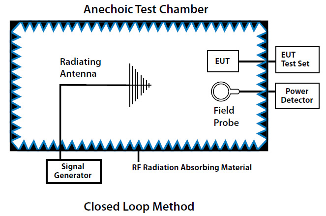 無論是閉迴路法還是替代法,均採用高功率訊號產生器連接至輻射天線,以便在測試待測物時進行可重複的射頻訊號傳輸,閉迴路法在測試過程中需要場強探棒的持續參與,而替代法僅指出可使用探棒來提升量測品質。
