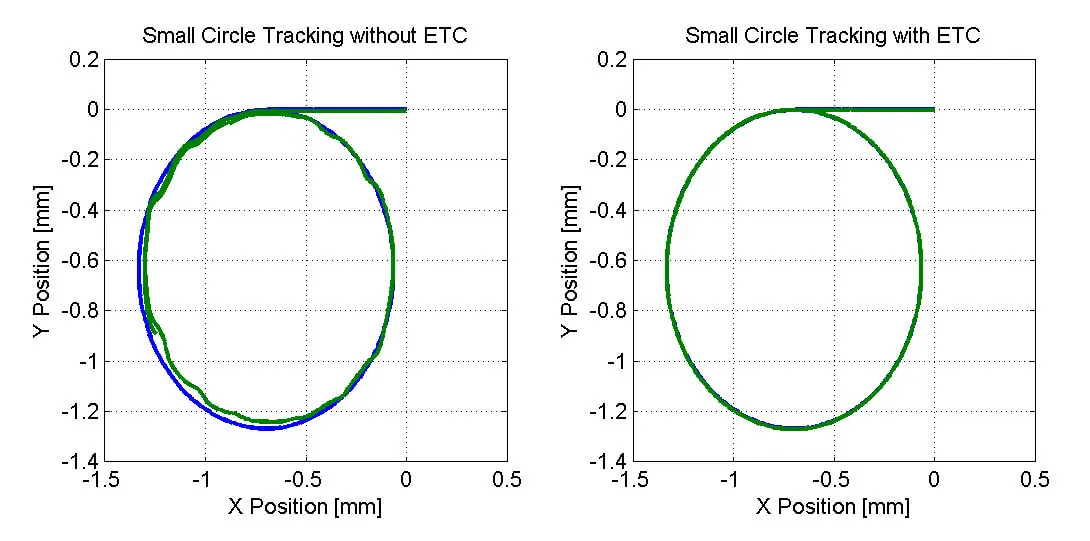 在 127 Hz 頻率下追蹤圓形路徑時,啟用與未啟用 ETC 的追蹤誤差比較。