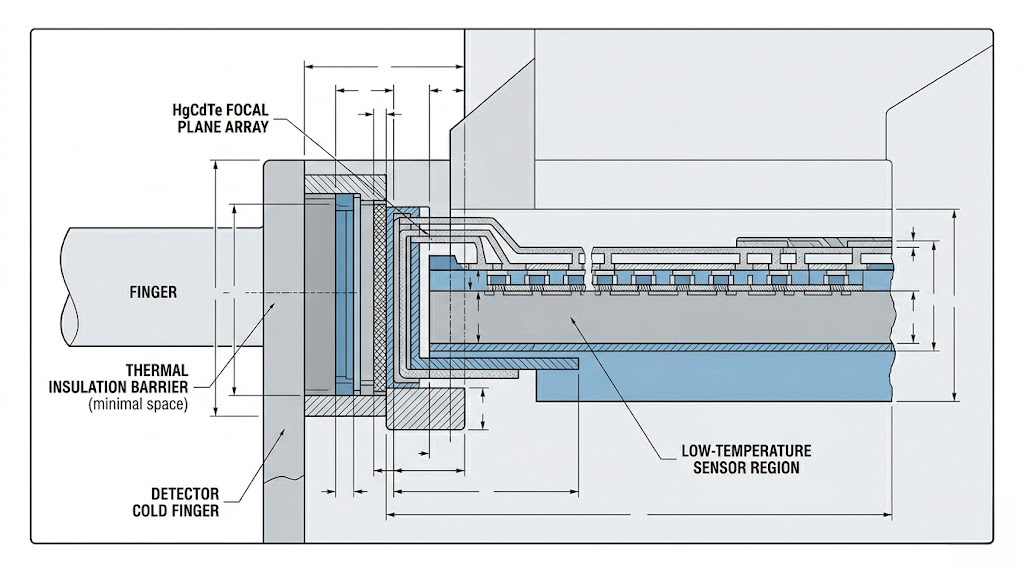 加固型冷卻式紅外線感測器,碲鎘汞陣列與低溫冷卻器介面示意圖,展示碲鎘汞焦點平面陣列、低溫冷指介面、低溫區域和熱隔離屏障,圖中以熱傳導和導電向量箭頭詳盡標註了其熱散逸路徑和訊號流向。