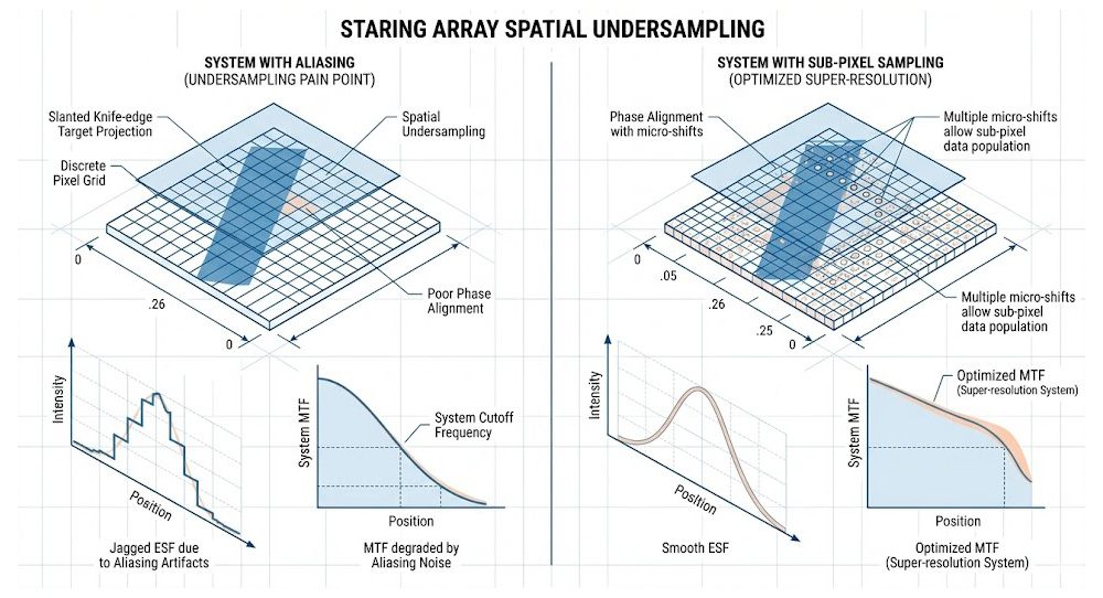 凝視型陣列採樣比較示意圖:欠採樣系統(左圖)因混疊引發鋸齒狀 ESF 與 MTF 退化;超解析度系統(右圖)藉由次像素採樣填充數據,重建平滑 ESF 曲線並優化 MTF。