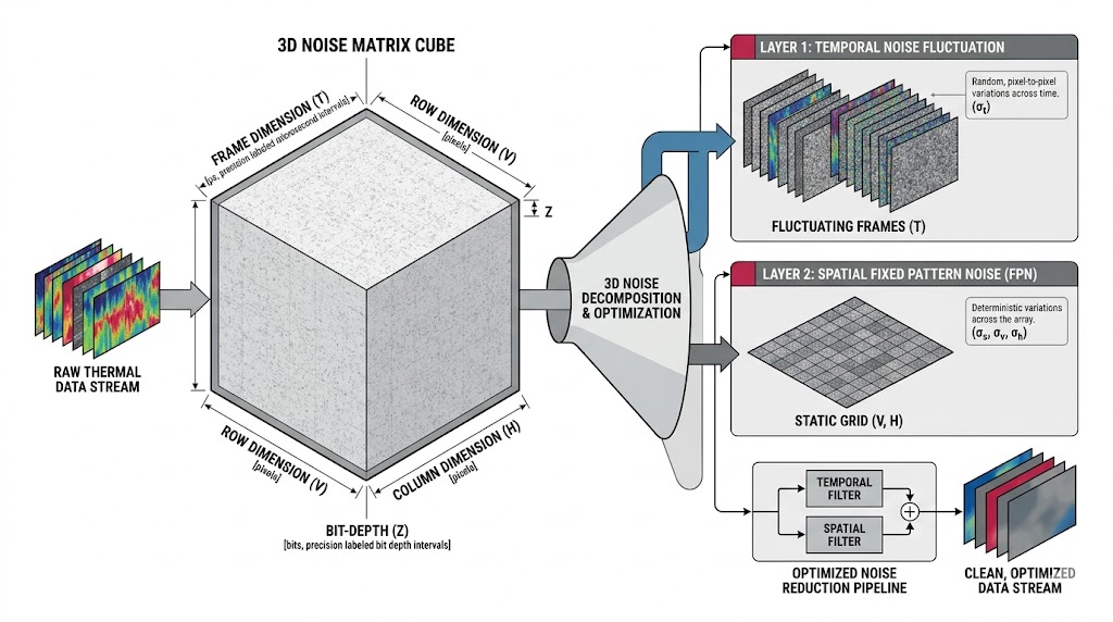 本圖呈現3D雜訊矩陣立方體,將原始熱成像數據流分解為隨時間變化的時域雜訊(層1)與靜態的空間固定圖案雜訊(層2),並透過優化雜訊消除演算法,實現清晰的熱成像數據流輸出。