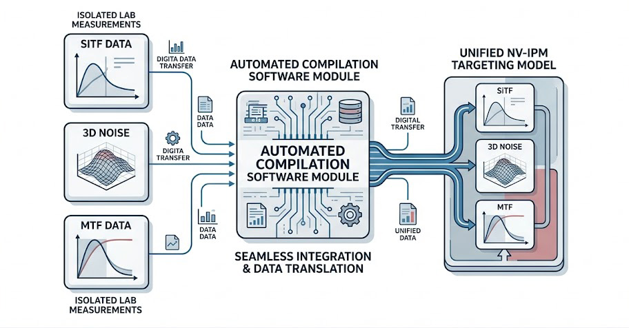 示意圖展示了透過自動化匯編軟體模組,將SiTF、3D雜訊與MTF等離散實驗室量測數據,無縫整合並轉譯為統一的NV-IPM標定模型,實現精確的數位資料傳輸。