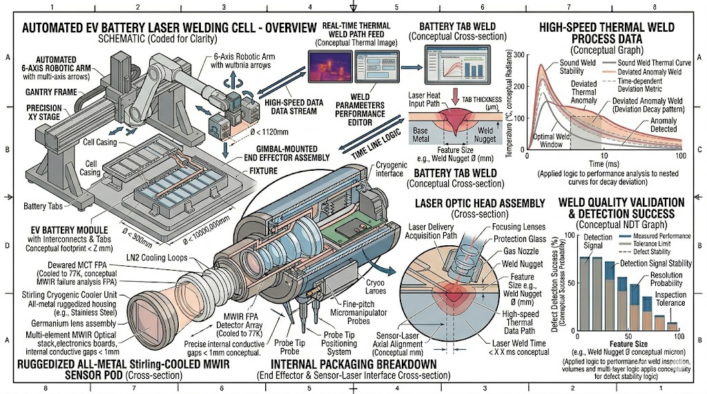 此示意圖說明電動車電池模組自動化雷射焊接室:六軸機械手臂整合雷射光學頭與加固型中波紅外感測器,對極耳焊接進行即時熱顯像品質驗證。