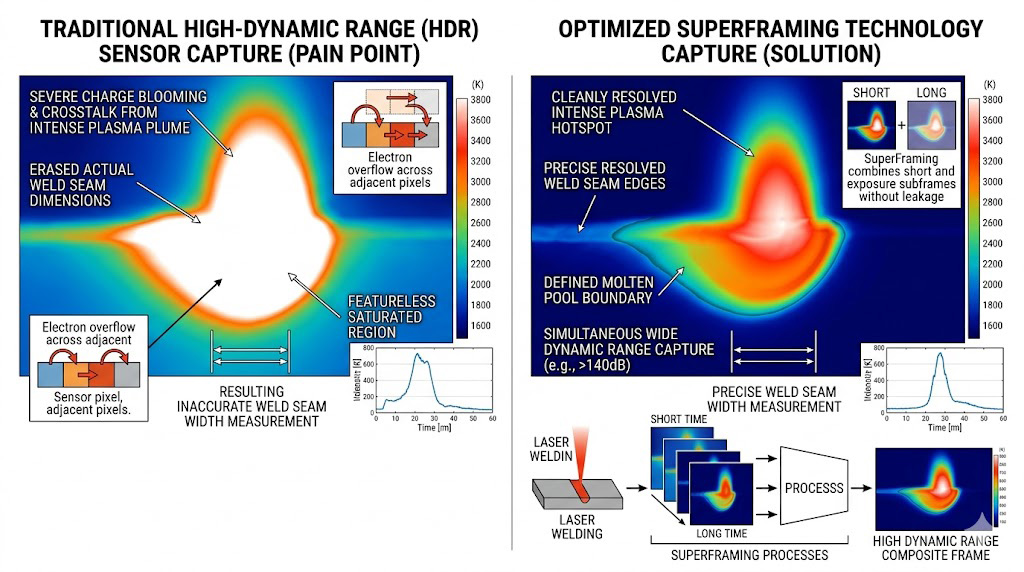 示意圖比較了雷射焊接監控中傳統 HDR 與優化超影格技術的差異,左側顯示強烈電漿柱和電荷溢散(Blooming)導致飽和區域,抹除焊縫尺寸。右側則乾淨解析高溫熱點與精確焊縫邊緣,清晰定義熔池邊界,達成寬動態範圍,實現精確幾何尺寸測量。