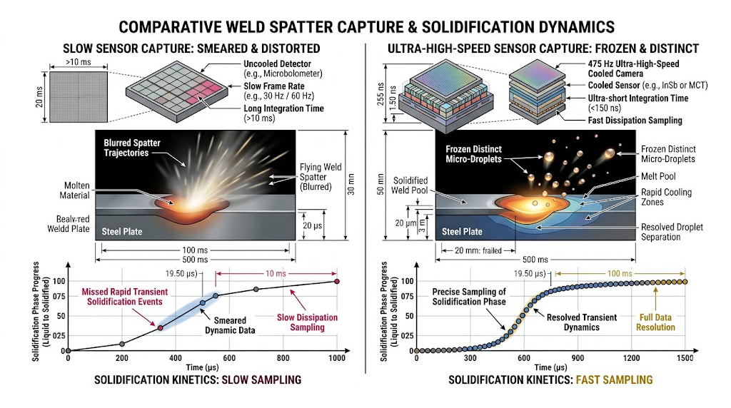 高反射金屬的熱傳導率極高,其熔化到凝固的相變過程僅在短短幾毫秒內發生,且常伴隨高速的微小熔滴飛濺 (Spatter)。若感測器的熱響應時間過長,或是全域幀率 (Frame rate) 無法達到 300 Hz 以上,高速移動的熱特徵在影像上將產生嚴重的熱拖影 (Thermal smearing)。在這種時間採樣交疊失真的情況下,工程師無法精準重建材料的真實冷卻曲線,進而難以預測殘餘應力與熱裂紋的發生機率。