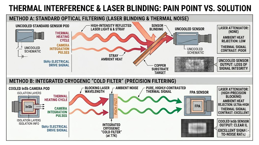 示意圖中對比未冷卻感測器雷射致盲痛點:冷卻式 InSb 相機採用「整合式低溫冷濾光片」,阻擋干擾,提供高對比和優異訊噪比的熱影像。