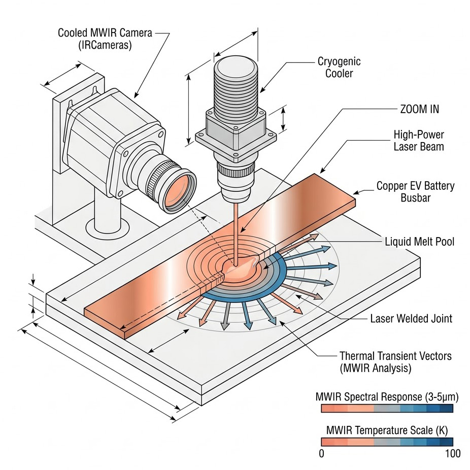 在電動車 (EV) 與大型儲能系統的快速發展下,動力電池模組的組裝高度仰賴先進雷射銲接技術。特別是在處理銅 (Copper) 與鋁 (Aluminum) 等高反射率金屬的導電極耳 (Battery tabs) 與匯流排 (Busbar) 銲接時,銲道品質直接決定了電池的內阻、充放電效率與熱失控 (Thermal runaway) 的安全風險。為了確保銲接過程中沒有產生氣孔、虛銲或微裂紋,利用非接觸式的中波紅外線 (MWIR, 3-5 µm) 攝影機,即時監控雷射與金屬作用瞬間的「熔池動態 (Melt pool dynamics)」與冷卻速率,已成為製程最佳化的核心指標。