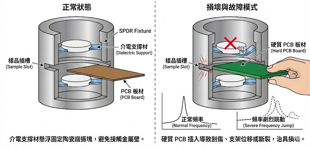 - 故障模式:樣品插槽是操作員最常接觸的區域,頻繁地插入硬質 PCB 板材,可能會刮傷金屬表面,甚至撞擊到內部的陶瓷或石英支架,若支架位移或斷裂,共振頻率將發生劇烈跳動,治具即告損壞。