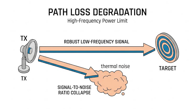 在 1 GHz 至 6 GHz 的低頻段,一般的固態射頻放大器即可提供足夠的功率來克服空間損耗,然而當掃描頻率攀升至 18 GHz 或高達 40 GHz 時,自由空間的路徑損耗變得極度巨大,若發射端無法提供足夠的高功率激發,抵達待測物表面的能量將微乎其微,對於本身已經具備極低雷達反射特性的隱身載具而言,其微弱的反射回波在漫長的回程中,會進一步衰減並最終被接收機的底層熱雜訊(Thermal Noise Floor)所淹沒。