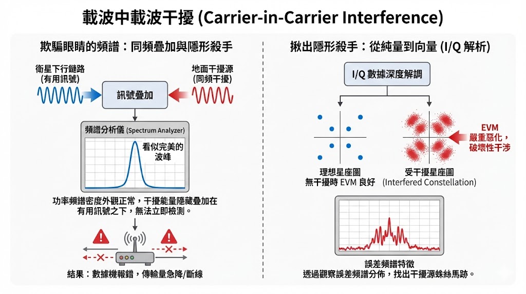 在各種干擾類型中,最讓地面站工程師頭痛的,莫過於「同頻干擾」,特別是所謂的 載波中載波干擾。