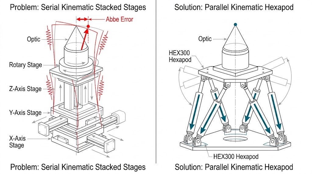 此圖解對比了傳統串聯堆疊平台與並聯六軸平台,左側顯示串聯架構因阿貝誤差與剛性流失,導致光學定位不穩定;右側六足平台結構更剛強且穩定。