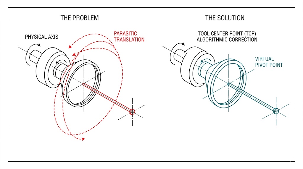圖片對比了物理軸旋轉產生的寄生位移(左),與利用 TCP 算法校正後實現的虛擬支點解決方案(右),有效消除誤差。