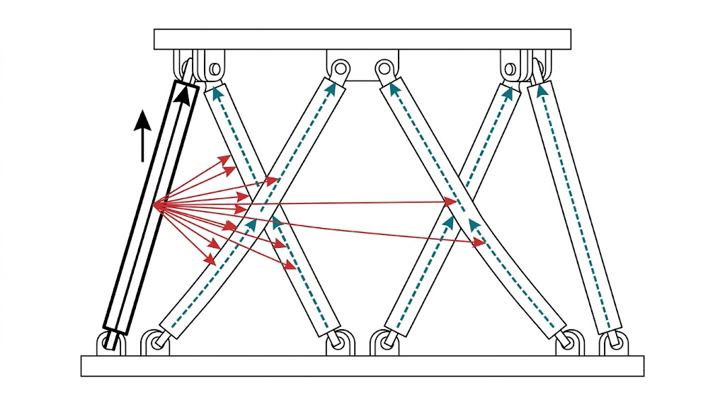 並聯平台作用力分析圖:左側支柱運動(黑箭頭)引發紅色跨軸干擾,深青色虛線箭頭代表前饋修正,重點在於抵消干擾,中和耦合影響。