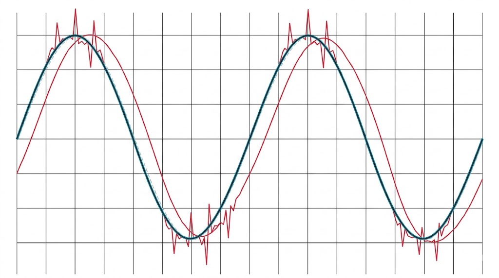 跟隨性能比較:粗深青線為無瑕諧波消除追蹤,紅線有嚴重相位滯後與諧波毛刺