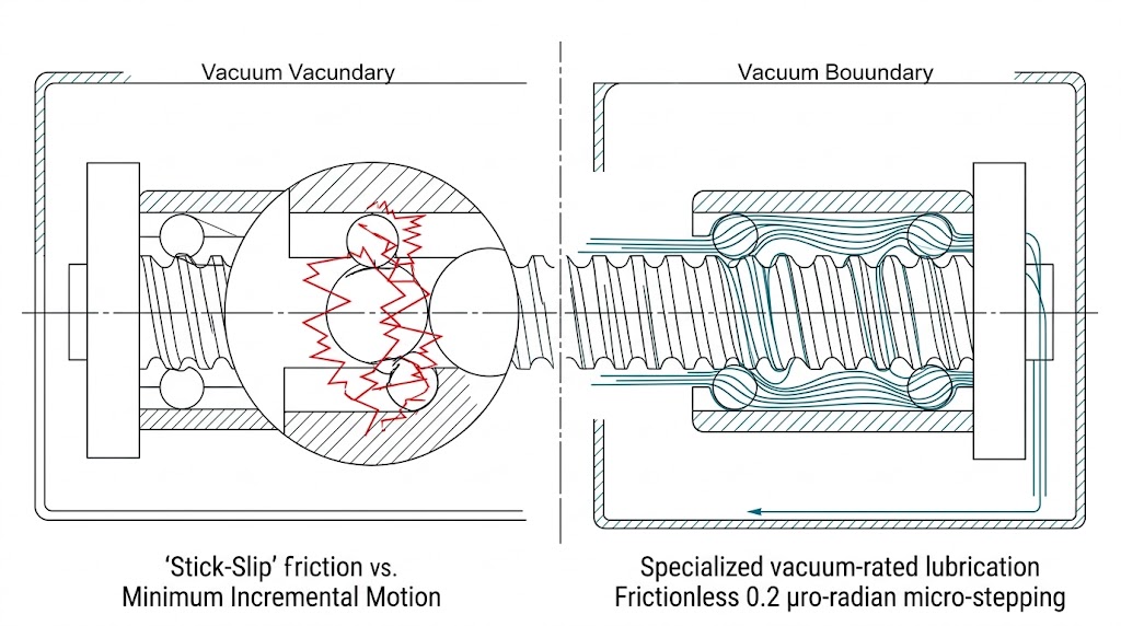 真空環境下絲槓對比:左側「粘滑」摩擦導致最小增量運動崩潰;右側使用專用潤滑實現無摩擦精確微步。