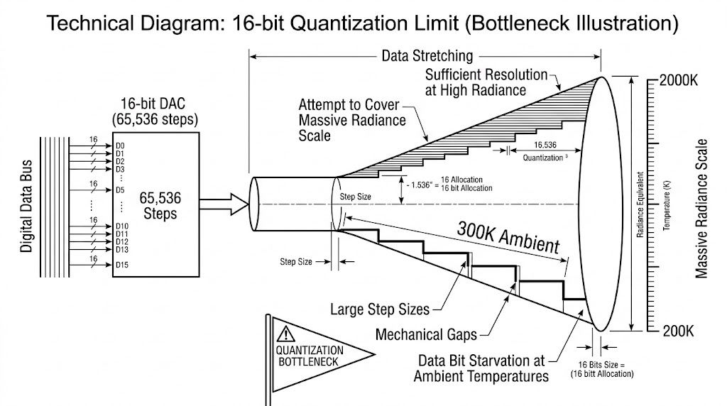 當前絕大多數的 IRSP 讀入積體電路 (RIIC) 與場景生成器,皆採用 16 位元 (16-bit) 的數位訊號介面,系統最多只能提供 65,536 個灰階,在涵蓋數個數量級的輻射動態範圍內,16 位元的線性量化深度已完全不敷使用,如果要讓最高端達到 2000K 的不失真模擬,低溫端就會缺乏足夠的位元數來描繪微小的溫度梯度,若不改變底層的資料傳輸與數位架構,系統將永遠受困於「要高溫就沒有低溫細節」的硬體死胡同。