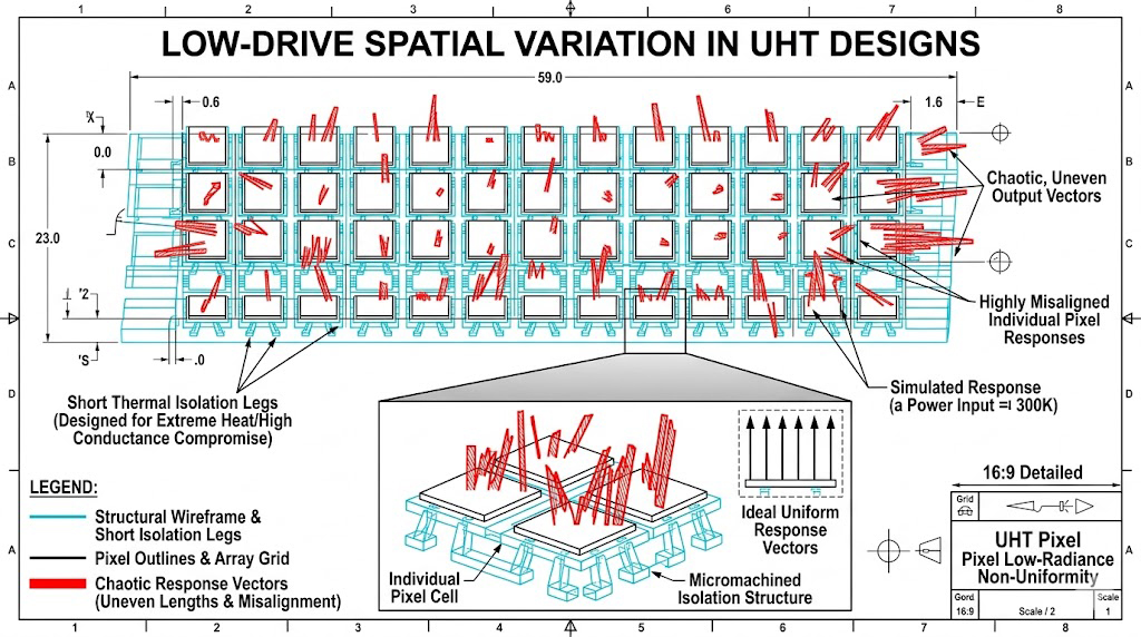 為了承受 2000K 級別的熱應力,新一代的超高溫 (UHT) 電阻式發射器像素採用了全新的高溫材料與特殊的物理幾何設計(如極短的熱隔離橋結構),然而物理模型預測顯示,這些專為高溫特化的像素,在輸入極微弱電流(模擬常溫背景)時,其個別像素之間的響應差異會比傳統像素大得多;這表示在低輻射區間,陣列的空間雜訊 (Spatial Noise) 會急遽放大,使得傳統的非均勻性校正 (NUC) 演算法面臨極大挑戰,若無法完美校正這些微小差異,300K 的背景場景將充滿嚴重的固定圖案雜訊 (FPN)。
