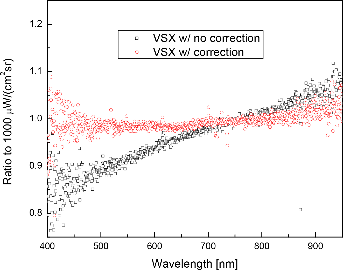 圖 9. VEO-2 在 0.01 µW/(cm²sr) 時的比較,上圖顯示 VEO-2 在 1000 µW/(cm²sr) 與 0.01 µW/(cm²sr) 之間光譜在校正前後的比例,相較之下,圖 3 中的 VSX 資料表現相當良好,VEO-2 的資料在 675 nm 附近顯示一個光譜特徵,這限制了燈絲電流校正的有效性。