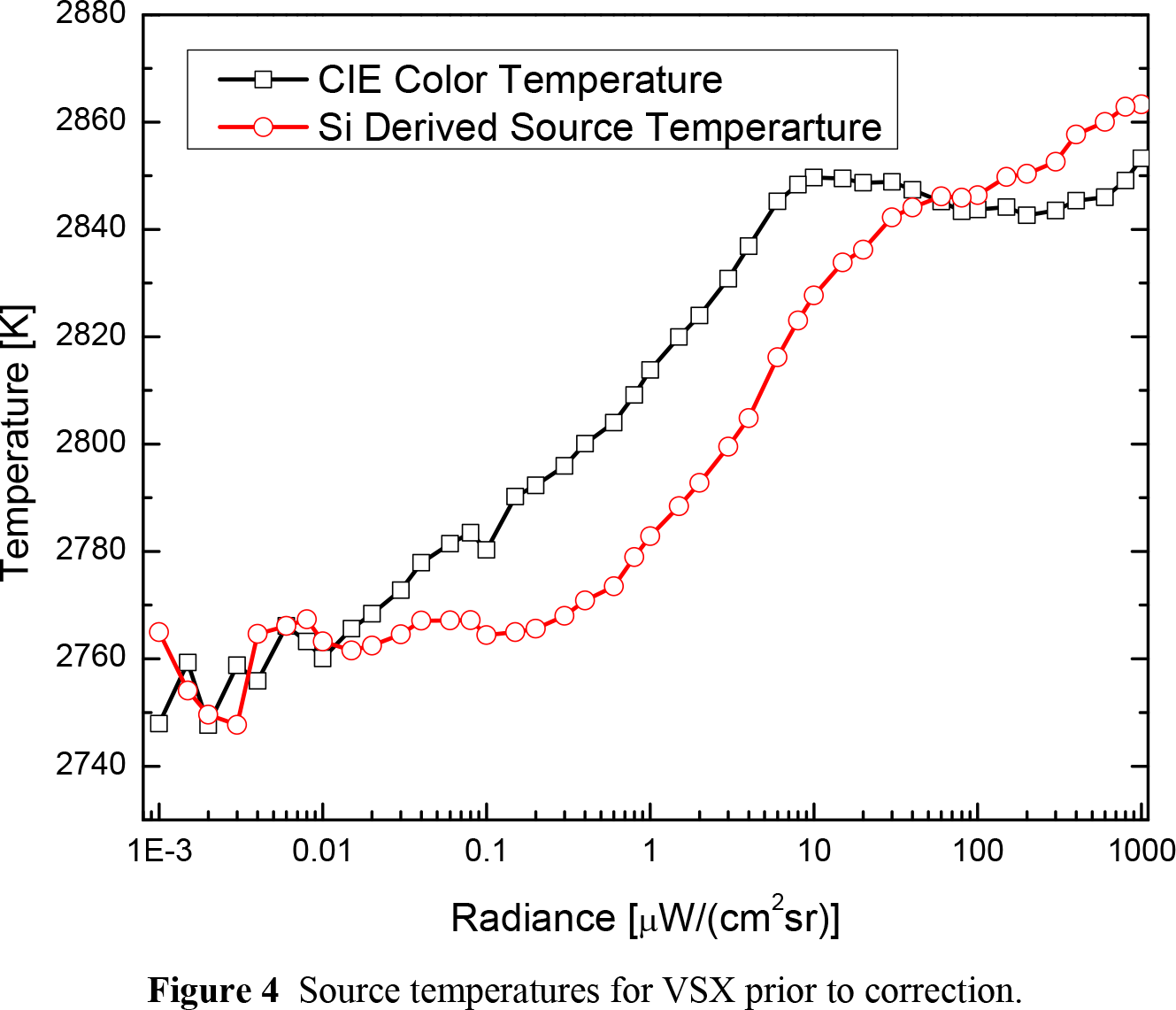 與 VSX 系統的行為類似,在 VEO-2 系統中,隨著其內部機械衰減器的逐漸關閉以降低輸出輻射亮度的過程中,透過標準 CIE 方法(主要依賴可見光波段)所推算出的光源色溫,與透過 Si/flat ratio 方法(對近紅外波段更敏感)所推算出的有效溫度,這兩種不同的溫度表徵值之間,也會開始逐漸產生並擴大偏差。然而,VEO-2 系統與 VSX 系統在此行為上的一個主要不同點體現在:對於 VEO-2 系統而言,當其輸出輻射亮度降低到 10 µW/(cm²sr) 以下的、相對更低的亮度水平時,上述兩種不同方法推算的溫度之間的偏差,會變得更為顯著且其變化趨勢也更為複雜,具體的實驗數據趨勢可以參見圖 7 中的詳細展示。